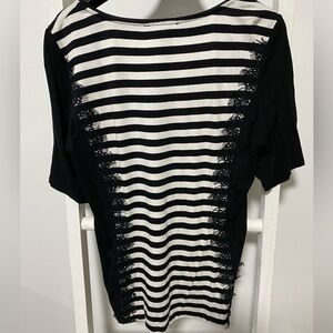 Elegant short sleeve top with black and white stripes. Features lace detailing for added style.