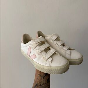 Stylish Veja sneakers with a cream base and pink accents. Features convenient velcro straps. Ideal for everyday wear.