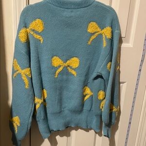 Chic and cozy POL sweater. Teal base with vibrant yellow bow details. Perfect for a stylish look.