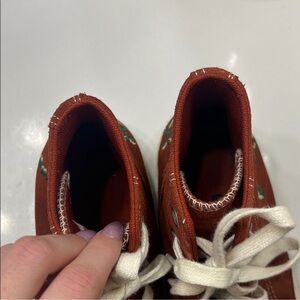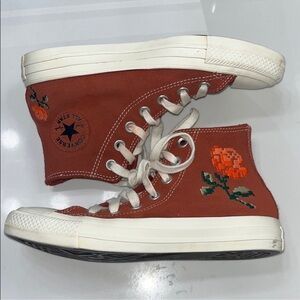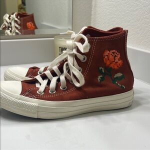 Stylish red Converse high-tops with floral design. Perfect for casual wear.