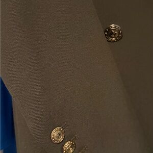 Elegant khaki blazer with a double-breasted style. Accented with gold buttons and front pockets. Ideal for formal settings.