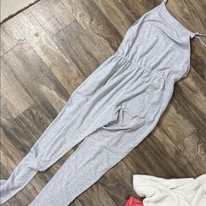Stylish light gray jumpsuit by Ambiance. Features a relaxed fit with adjustable straps. Ideal for casual outings. Size medium. Normal wear