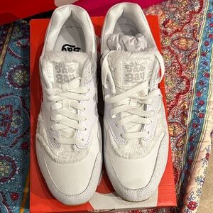 Chic Nike sneakers in white and cream and red accents. Ideal for everyday style, repoing the bay these shoes are clean!