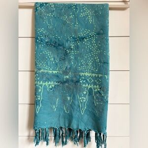Beautiful batik teal scarf with green patterns. No labels attached but feels like cotton rayon blend. Features fringe detailing. Please note in lat pic a few barely noticeable random rust-like spots.