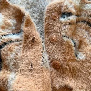 Cozy fuzzy cropped cardigan with a stylish swirl pattern. Features shades of tan, black, and cream.