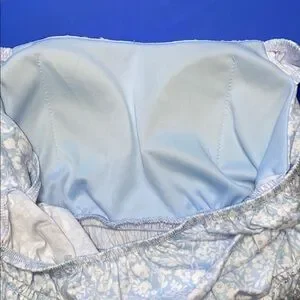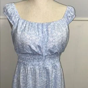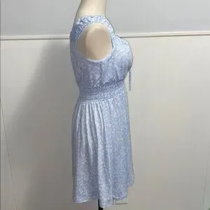 Light blue mini dress with delicate floral pattern. Features a gathered waist and cap sleeves. Ideal for casual outings. Built in bra