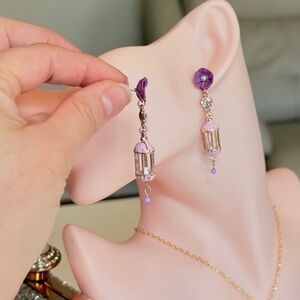 Elegant drop earrings featuring purple floral accents and pink cage design. Perfect for adding a touch of color to any outfit.