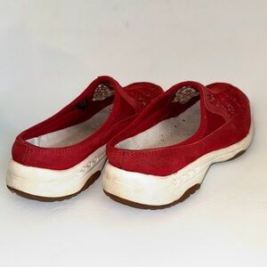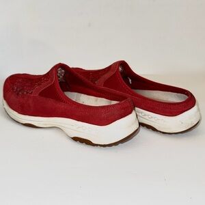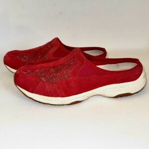 Red perforated suede comfort slip-on athletic walking comfort mules clogs, Easy Spirit brand, “ES Travel Lace” style, size 8.