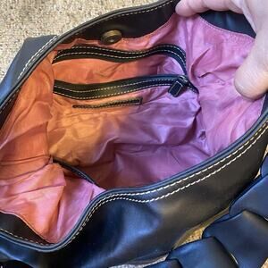 The Vintage Tommy Hilfiger Shoulder Bag Purse in black faux leather with gold tone hardware is a stylish and versatile accessory for women. This small crescent-shaped bag features a magnetic closure, brown handle/strap, and gold hardware accents. Perfect for travel, parties, casual outings, or business meetings, this purse is lined with pink fabric and includes inner pockets for organization. The vintage charm, along with the iconic Tommy Hilfiger brand, adds a touch of retro flair to any outfit.