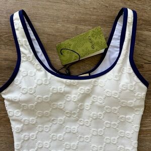 Elegant Gucci swimsuit in white with navy accents. Features a unique textured design.