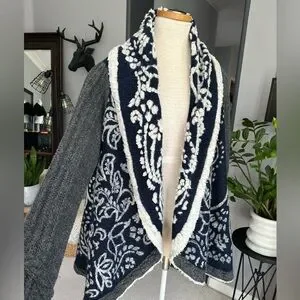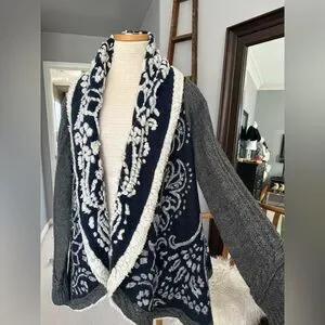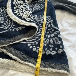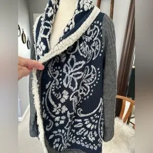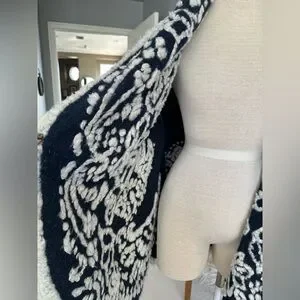 Viral “sleeping in snow” open cardigan by Anthropologie. Size large, so cute and cozy, heavy textured details, flairs at hip. So cute on. Measurements in pics. Stay cozy and stylish with this navy and gray sweater. Beautiful floral pattern. Happy Poshing!