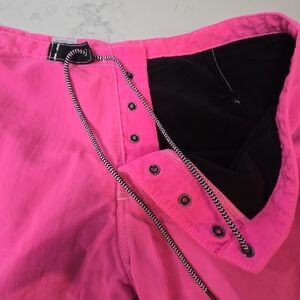 Authentic vintage Katin Custom surf trunks featuring bright neon pink and black colorway with original Kanvas by Katin labels. These classic surf trunks are made in the USA and are highly collectible among surf and vintage enthusiasts.