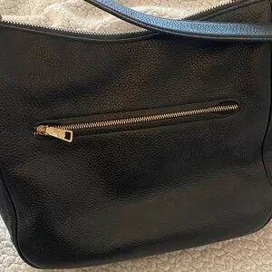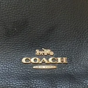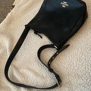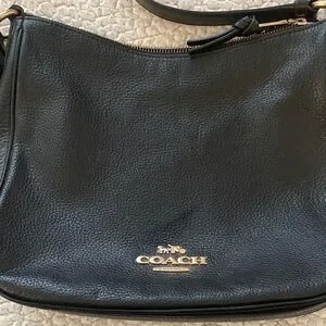 Sleek and stylish Coach shoulder bag. Crafted from black pebbled leather. Features gold-tone accents.