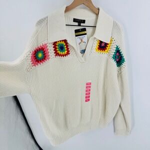 Joseph A. Johnny collar sweater features vibrant crochet granny square patches along the shoulders and neckline for a bohemian touch. This cream-colored knit top is crafted with a relaxed fit, drop shoulders, and a classic v-neckline with a spread collar. The ribbed cuffs and hem provide a polished finish to this eclectic, textured piece.