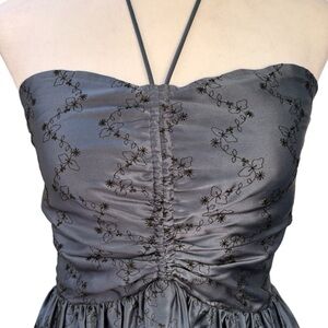 - Micro size black grommets connected through embroidery of delicate black vines creating an abstract floral pattern