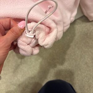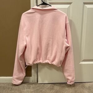 Chic light pink bomber jacket. Features zip closure and drawstring hem. Perfect for casual wear.