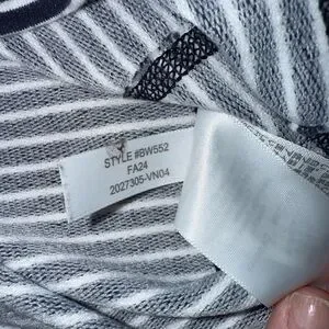 The product is a men's Sz L J Crew Performance Pullover in a blue and white striped design, featuring a 1/4 zip closure and a mock neck neckline. This pullover is made from a blended fabric of polyester and spandex, offering easy care, lightweight comfort, and stretch for active movements. It is suitable for various occasions including travel, activewear, casual outings, and business settings. With a classic and preppy style, this pullover is perfect for winter, fall, and spring seasons, making it ideal for activities like walking, golf, and running & jogging.