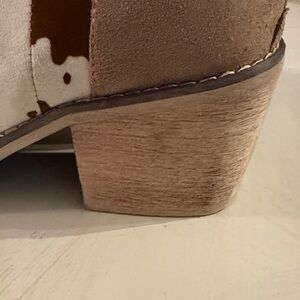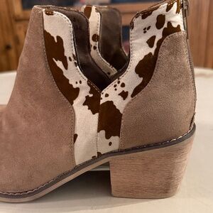 Chic ankle boots with a stylish cow print detail. Perfect blend of comfort and fashion. Women’s size 9