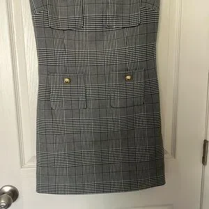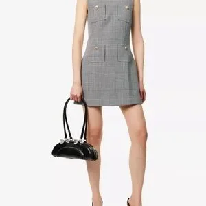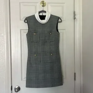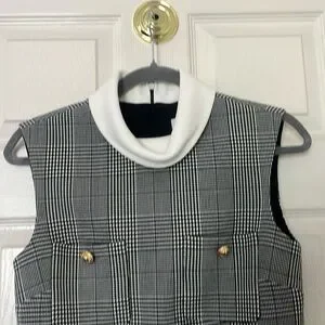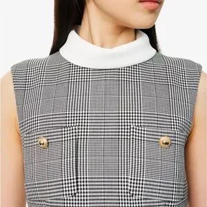 This elegant gray and white sheath dress by Self-Portrait features a sleeveless design with a mock neck, perfect for a professional work setting. The structured silhouette and classic plaid pattern offer a timeless and versatile look, ideal for both casual and business occasions.