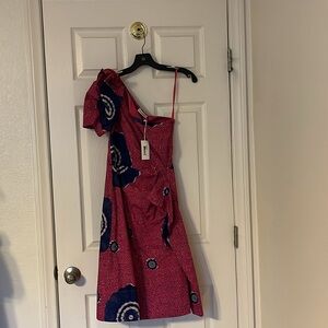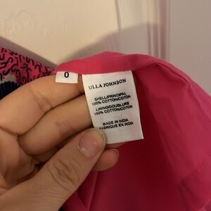 This stunning sundress by Ulla Johnson features a vibrant pink hue with an asymmetrical, ruffled design. The one-shoulder neckline adds a touch of elegance, while the tie front detail accentuates the waist. Perfect for a wedding guest or cocktail event, this dress offers a playful yet sophisticated look.