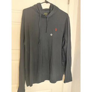 Classic Polo Ralph Lauren hoodie in black featuring the iconic red embroidered logo on the chest. Lightweight and comfortable with a drawstring hood and long sleeves. Perfect for casual wear or layering.