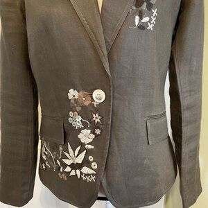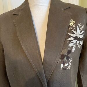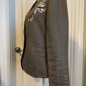 Chic fully lined linen, olive green blazer/jacket with floral embroidery. 2 pockets. Back slit. Stylish and versatile. Ideal for any occasion. Size 8. Pit to pit 18”. Length 24”. Jacket is in Excellent condition was in storage for a few years. Will be steam cleaned.