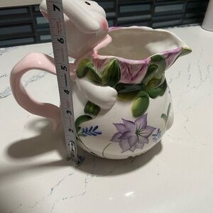 Charming ceramic pitcher featuring a playful bunny design with vibrant floral accents. Perfect for adding a touch of whimsy to your home decor. No chips or scratches.