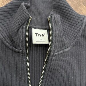 Chic black bomber jacket by TNA. Features a ribbed texture and zip-up front. Perfect for layering.