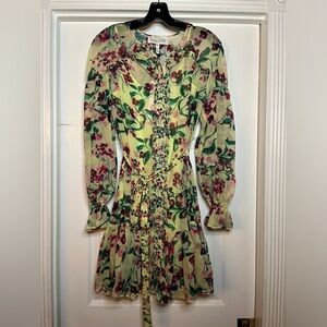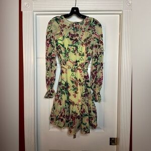 NWT SALONI- Pixie Dress- Silk Georgette in Canary Blossom. Size 2. Silk floral button down with belt and elastic wrist sleeves. Interior slip.