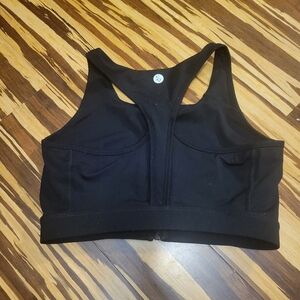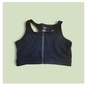 Sleek black sports bra with front zipper. Offers comfort and support. Ideal for active wear.