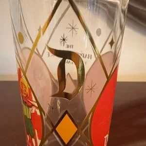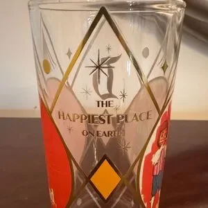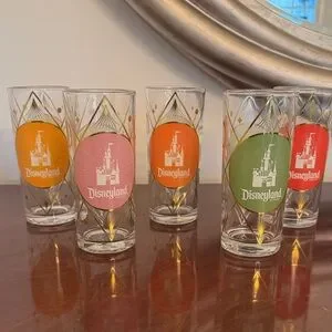 Charming Disneyland glasses with colorful designs. Each is illustrated with scenes from various Disneyland attractions plus the traditional logos and icons. Features gold detailing and iconic castle imagery. Perfect for Disney enthusiasts.