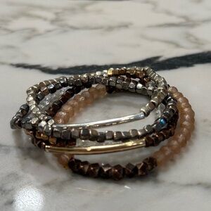 This gorgeous set of five beaded stretch bracelets is perfect for layering or wearing individually. Featuring a mix of bronze, silver, gold, clear, and peach-toned beads, these bracelets add a touch of elegance and versatility to any outfit. Comfortable stretch fit ensures easy wear.
