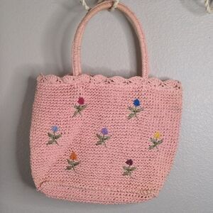 Vintage 80s Charter Club Classics pastel pink straw bag with little rosette flowers embroidered on the front. The woven edging has a lacy scalloped pattern to add a touch of romantic storybook style. This adorable cottage straw bag is perfect for a brunch, tea party, bridal or baby shower, or just a spring summer afternoon at the park.