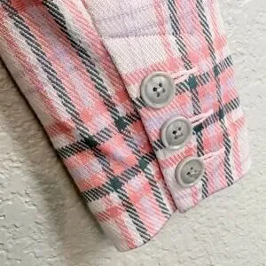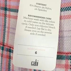 This CAbi women's Playdate pink plaid set features a cropped bolero jacket with removable shoulder pads and high-rise matching pants in size Medium. The two-piece outfit is new with tags on the pants and new without tags on the jacket. Perfect for work or social events, this coordinated look combines a face-framing collar with a modern cropped length.