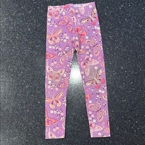 6 pack of leggings includes pink, black, purple, gray, heart & butterfly designs. Perfect for playful days. Some discoloration on knees.
