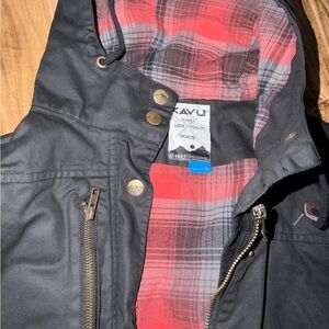Kavu Sundowner Black Canvas Jacket Plaid Lined Snap Front Zip Hood Womens XL