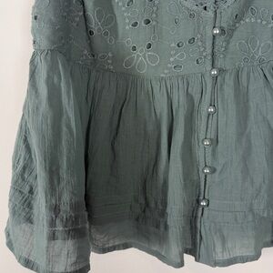 Chic teal camisole with eyelet detailing. Features button front and adjustable straps. Ideal for casual outings.