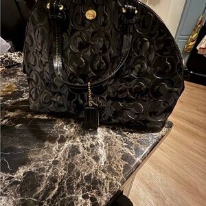 Sleek and stylish Coach satchel. Features glossy embossed design. Perfect for any occasion.