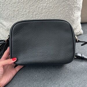 Elevate your style with this elegant Gucci black leather crossbody bag. Perfect for any occasion, it features a sleek design and a convenient tassel detail.