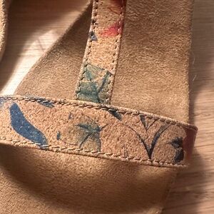 Elegant floral sandals with a tan base. Comfortable and stylish for any outing.
