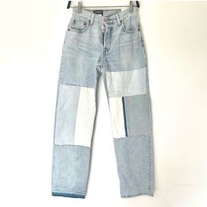 Chic Levi's straight leg jeans. Light blue and white patchwork design. Ideal for casual wear. These are 24x30
