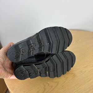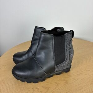 Durable and stylish Sorel Joan of Arctic Wedge ankle snow boots in girls size 1, featuring a hidden wedge heel and waterproof leather design for winter and rainy weather.