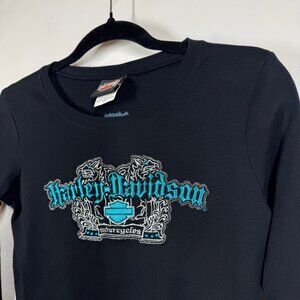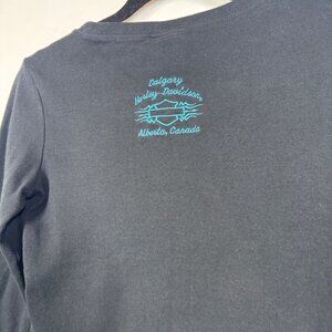 harley davidson shirt, long sleeve graphic tee, biker style top, black moto shirt, women harley tee, calgary harley davidson, alberta canada shirt, cotton long sleeve top, motorcycle graphic shirt, casual biker wear, vintage harley style, women size small tee