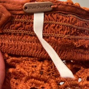Boho crochet halter top in vibrant rust orange. Ideal for casual wear or beach outings. Unique and stylish.