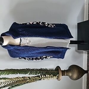 Navy floral print including pink, light blue, green, and rust, on the 3/4 length sleeves and collar