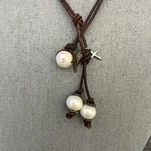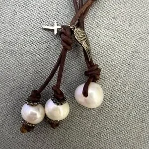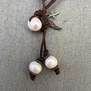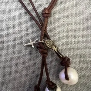 This elegant necklace features genuine brown leather cord w genuine white pearls w a cross n feather charm.