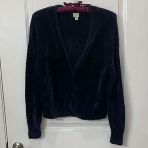 Soft and stylish black cardigan. Perfect for cozy layering. Metallic threading makes a slight shimmer. Excellent condition!
