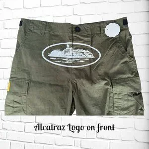 Level up your streetwear game with these rare Corteiz cargo shorts featuring the iconic “Alcatraz” design in bold white across the front.