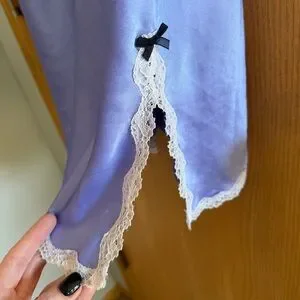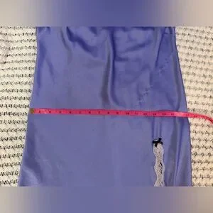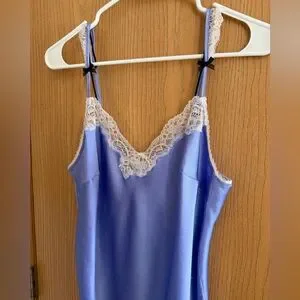 Gently used Y2K periwinkle purple nightgown from Victoria’s Secret. Features cream lace trim, a side slit on the left leg, and black bows on each adjustable spaghetti strap and at the top of the side slit. There is a run on the front of the fabric (see photos). Women’s size medium.
