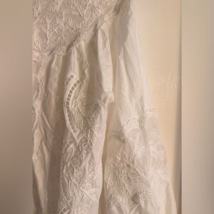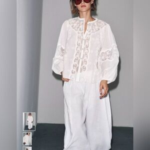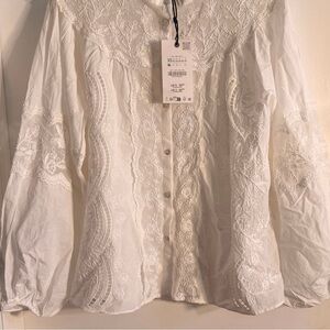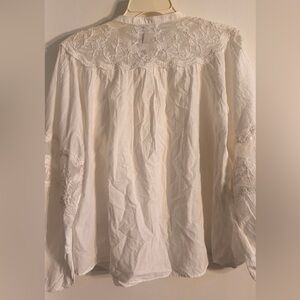 Long sleeve, round neck shirt. Features matching combined embroidery detail. Button-up front.